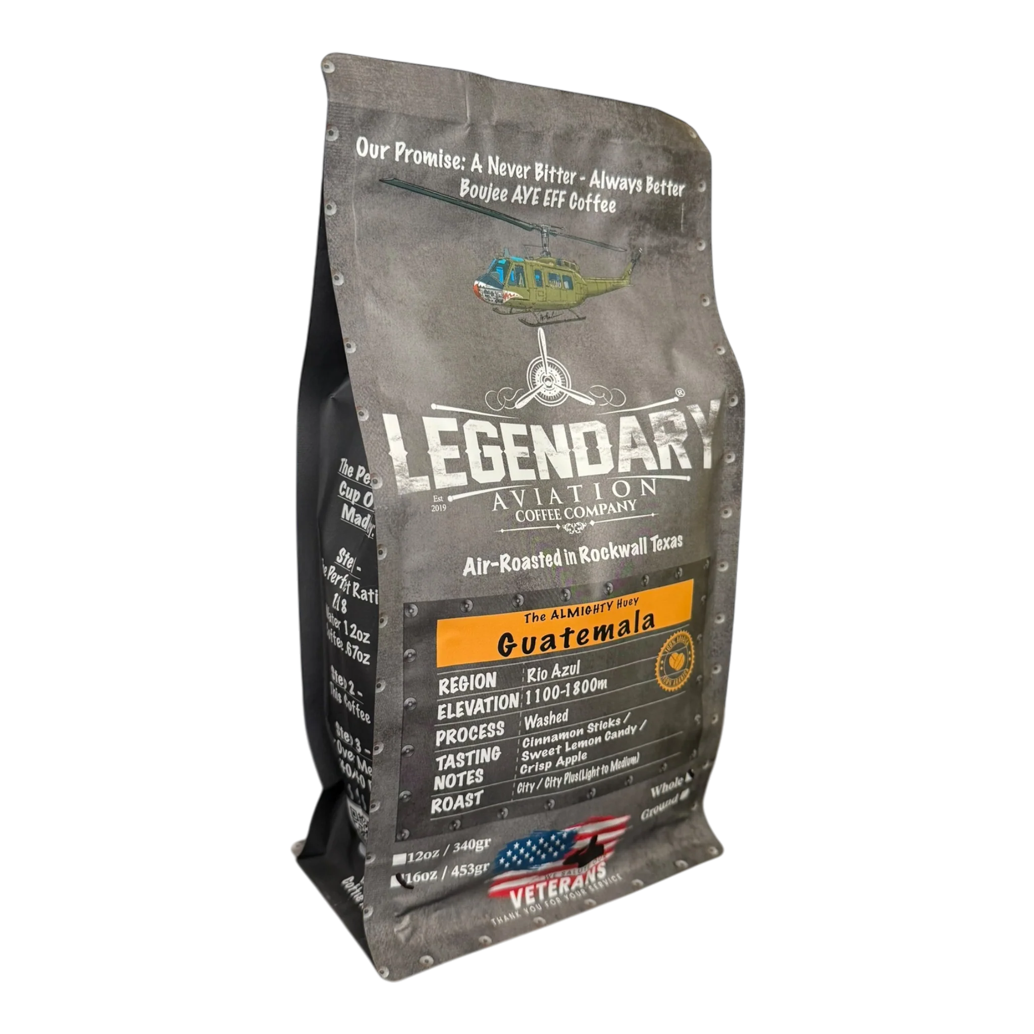 Introducing the ALMIGHTY Huey Guatemala Coffee from Legendary Aviation Coffee Company, a well-rounded roast that pays tribute to the legendary Huey helicopter. This exceptional coffee hails from the remote town of Jacaltenango in Guatemalaâs Rio Azul region, crafted by the skilled farmers of Coop Rio Azul.
