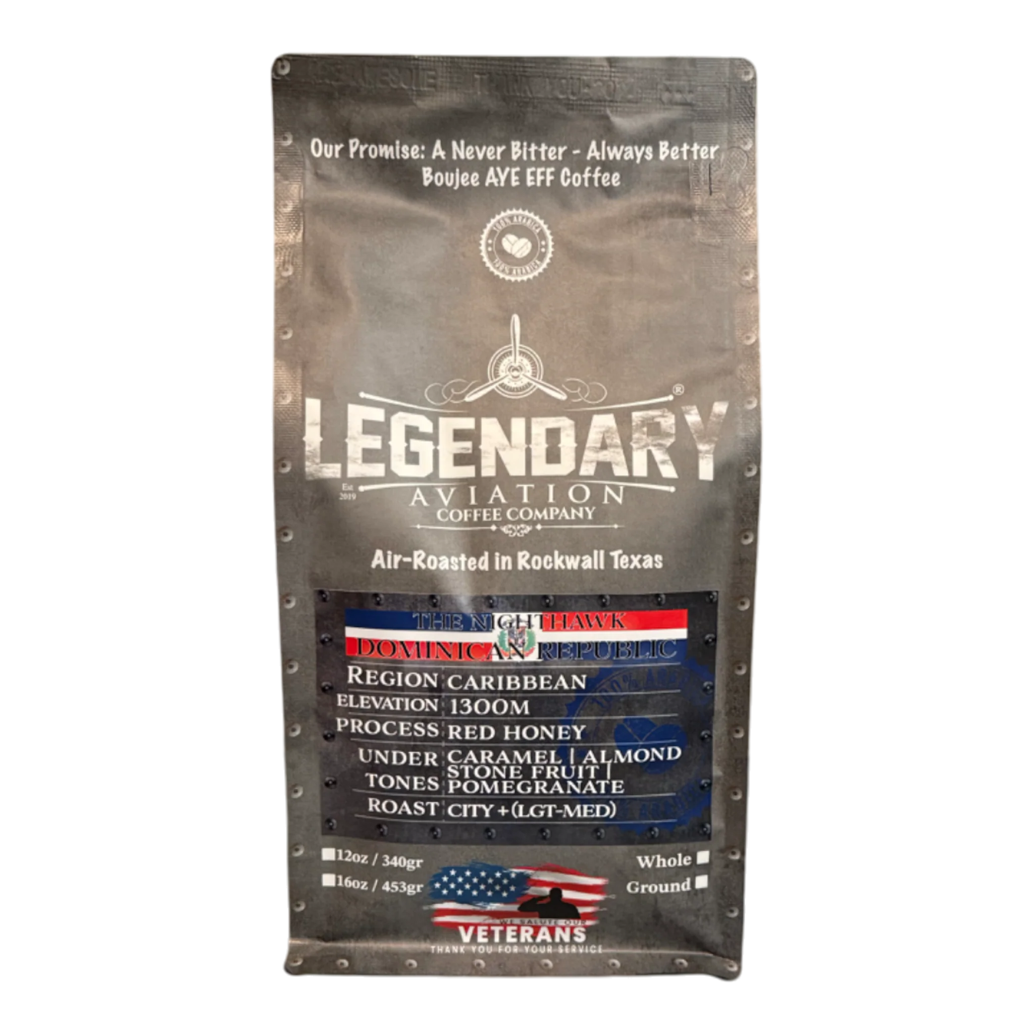 Prepare for aĀ stealthy smooth coffee experience with the F-117 Nighthawk, our highest-rated coffee to date. Just like its namesake, this 92-point CoffeeReview-rated Dominican Republic estate coffee flies under the radar with precision and impact. With a Red Honey process, this single-origin masterpiece delivers a rich, low-acidic profile, loaded with caramel, almond, stone fruit, and pomegranate undertones.