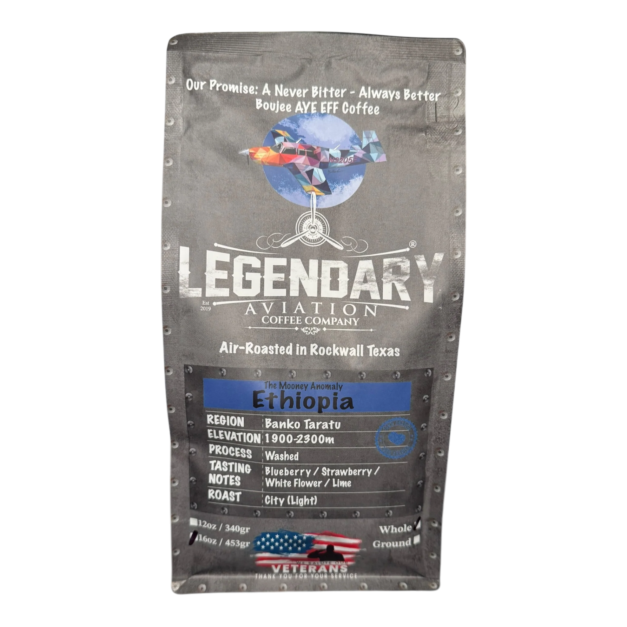 Introducing the Mooney Anomaly Ethiopian Coffee from Legendary Aviation Coffee Company, a unique collaboration with the owner of the iconic Mooney Anomaly aircraft. Sourced from Ethiopia’s Banko Taratu region, this light roast (City), grown at elevations of 1,900 - 2,300 meters created an exceptionally clean, vibrant cup of coffee.